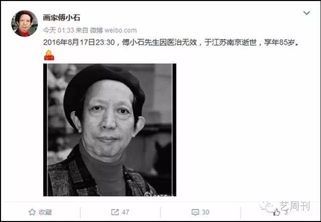 昨天晚上十一点半,傅抱石长子傅小石的个人微博发布了傅小石先生辞世的消息。微博写道:“傅小石先生因医治无效,于江苏南京逝世,享年85岁。”
