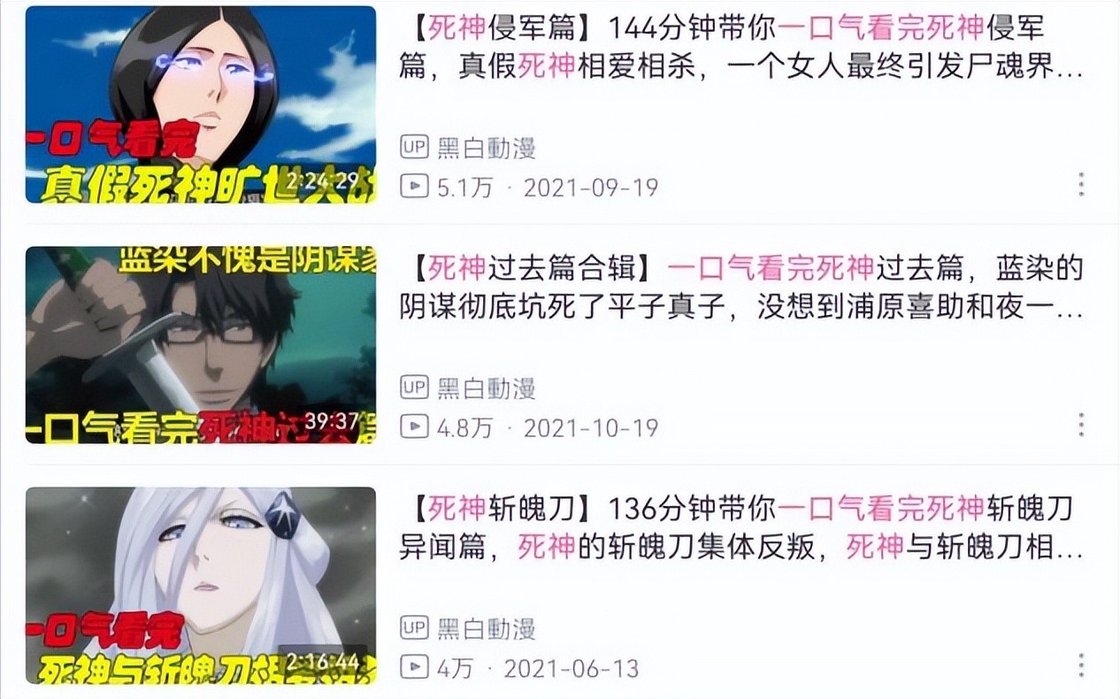 《死神》另一个引流难的问题就在于它的篇幅太长了,《死神》漫画画了十五年,一共有687话,光登场的人物都有五百个左右。让一个新观众从头开始补《死神》是不现实的,所以就需要up主制作解说视频,例如《五分钟带你看懂死神xx篇》,《一口气看完死神剧情》等等,帮助新粉理清之前的人物关系,并且迅速理解《死神》的世界观。