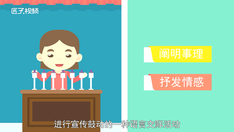 演讲是在公众场合,以有声语言为主要手段,以体态语言为辅助手段,针对某个具体问题,鲜明、完整地发表自己的见解和主张,阐明事理或抒发情感,进行宣传鼓动的一种语言交际活动。