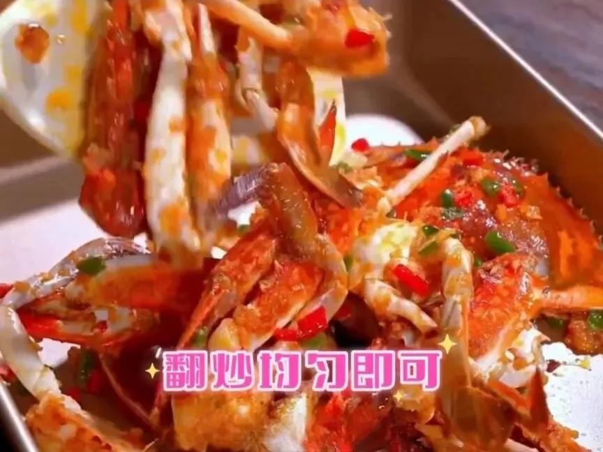 步骤:将螃蟹洗净备用。将盐、黑胡椒粉混合均匀,将螃蟹裹上一层粉。锅中加入油,烧至七成热,将螃蟹放入煎至两面金黄。取出螃蟹,将原锅中的油留少许,加入干辣椒、葱姜蒜末炒香。最后将炒香的干辣椒、葱姜蒜末倒在螃蟹上,拌匀即可。