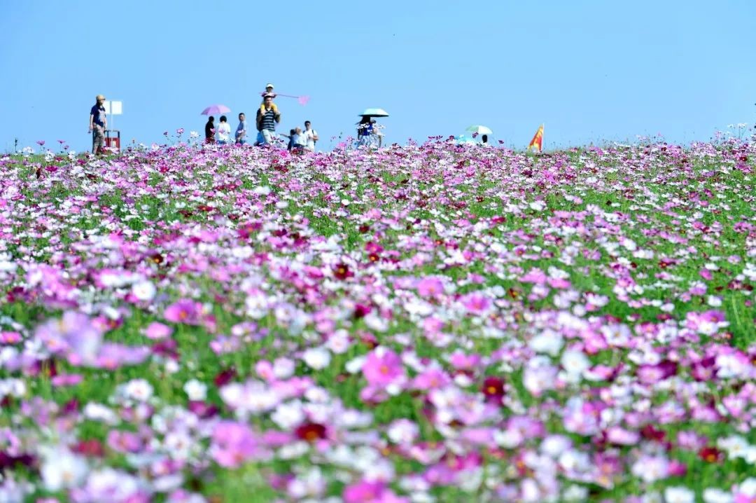 在木兰草原,3000亩格桑花绽放成海,粉白紫色的格桑花蔚为壮观。格桑花的花枝可长至齐腰高度,穿行其中,被花海环绕包围,是拍照好去处。