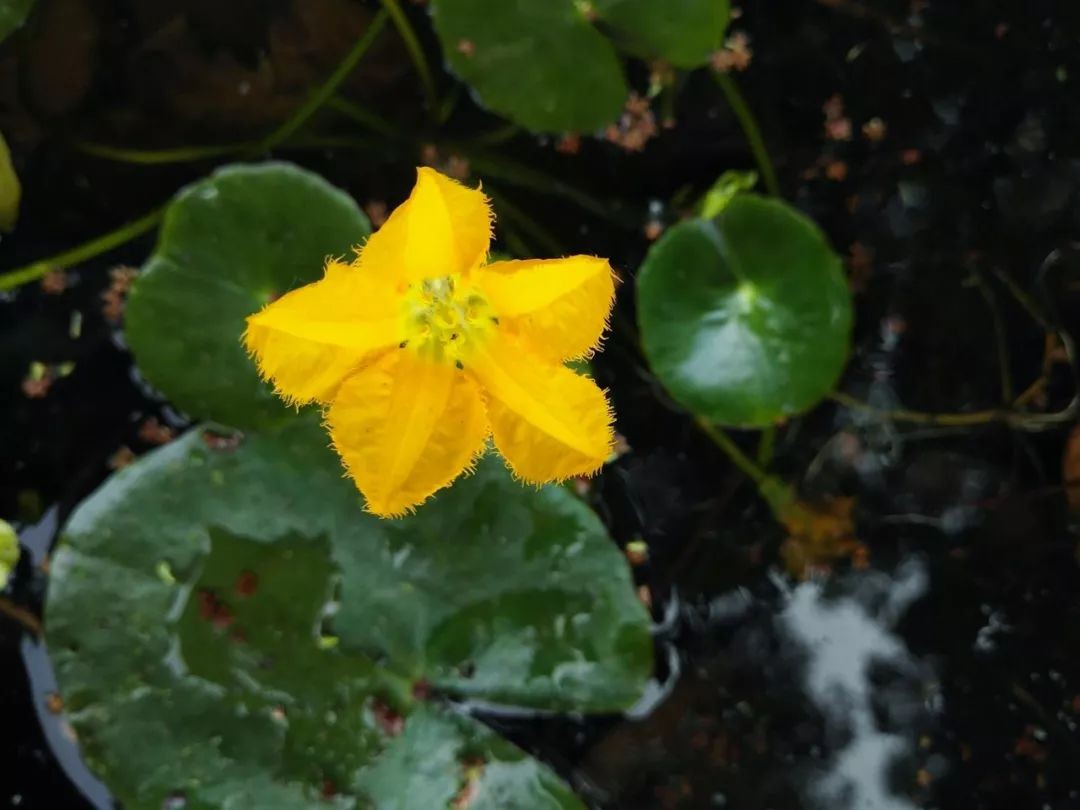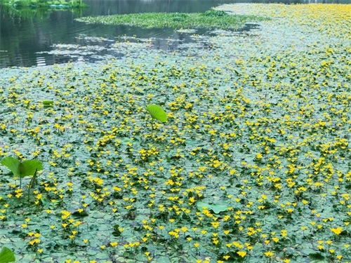 大片的荇菜开着黄色的小花,花瓣边缘如细碎蕾丝,密密麻麻浮在水面上,蔚为壮观。正值盛花期,花期延续到10月。