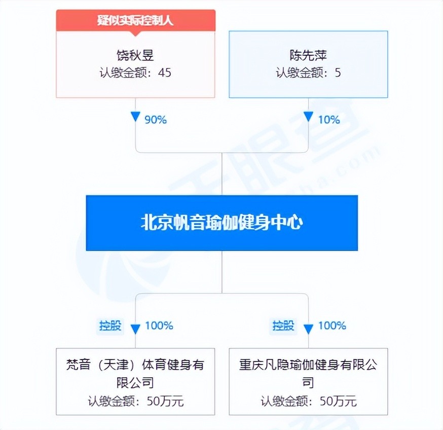 天眼查显示,北京帆音瑜伽健身中心成立于2007年9月18日,注册资本为50万元,由饶秋昱(饶秋昱系饶秋玉别名)担任法定代表人。股权信息显示,饶秋昱持有北京帆音瑜伽健身中心90%的股权,是北京帆音瑜伽健身中心的大股东、最终受益人和实际控制人,陈先萍持有剩余的10%的股权。