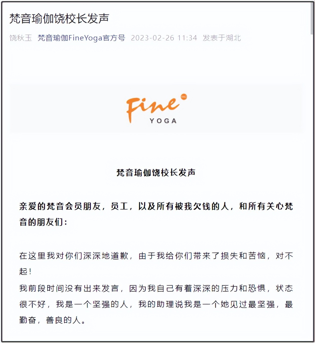一时间,梵音瑜伽成了舆论关注的焦点。对于外界越来越多的负面声音,梵音瑜伽创始人兼校长饶秋玉于2月26日发表回应称,受疫情影响,梵音瑜伽经营困难,目前公司的确有着高达几个亿的巨额债务,但自己会努力通过各种方式来还清所有的欠款。