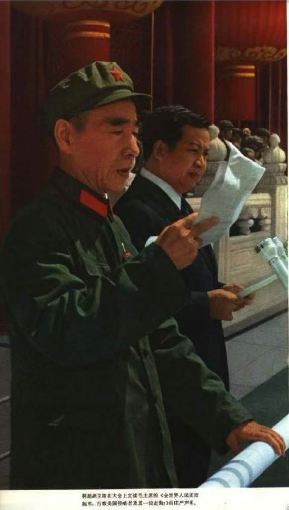 大会由周恩来主持,林彪拖着其长长的湖北黄冈口音,宣读了毛泽东的那篇《全世界人民团结起来,打败美国侵略者及其一切走狗》声明,史称《五·二零声明》。