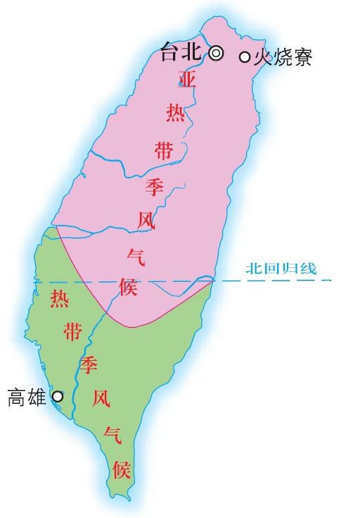 台湾横跨北回归线,中部及北部属亚热带季风气候,南部属热带季风气候,整体气候夏季长且潮湿,冬季较短且温暖。降水丰沛,平均年降雨量超过2500毫米,台湾东北部的火烧寮年均降水6500多毫米,最高达8408毫米(1912年),一年降了北京十几年的降水量,称为中国“雨极”。