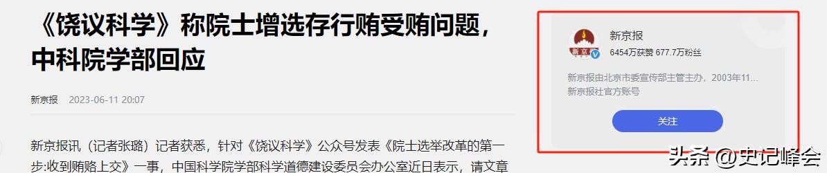 2023-06-12——九派新闻——首都医科大学校长饶毅发文称院士增选中有行贿受贿,中国科学院相关部门回应