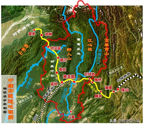 从图上可以看到,史迪威公路的起点是印度东北地区的雷多镇(记住这个名字)。从雷多往东南,经缅甸的班哨、欣贝延、德乃、勒瓦到达密支那后,分为南北两线。
