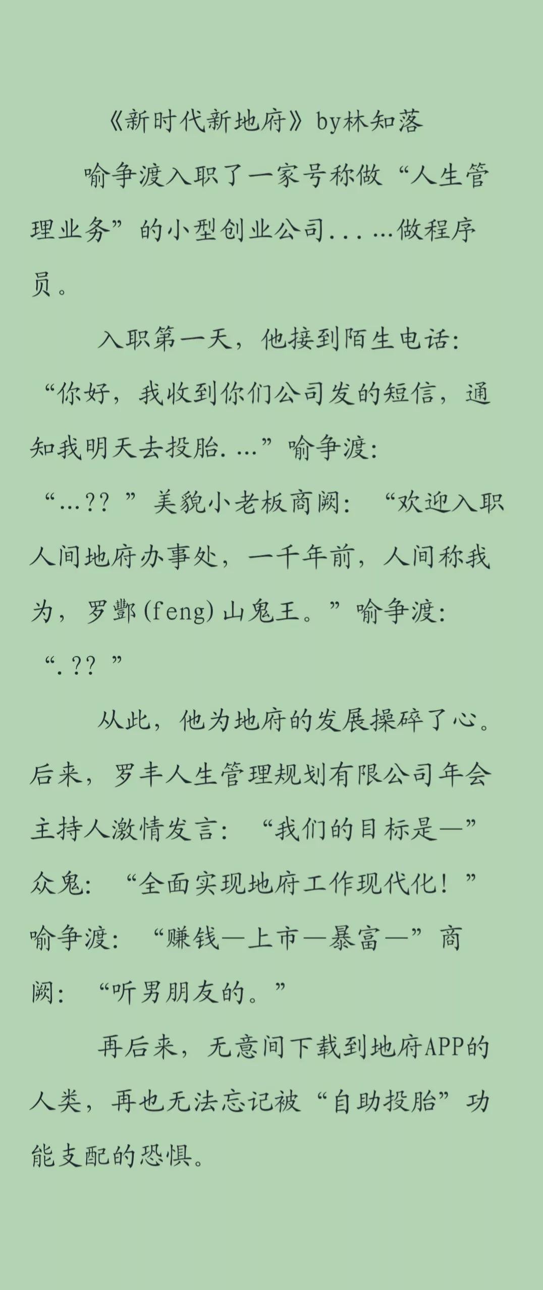 短评:攻是鬼王,受是程序员,攻热衷于游戏,不善经营公司,受是个讲究科学思维的脑洞达人,还做出了神奇的地府app,于是攻抱紧受的大腿努力把地府做大做强!总体来说挺沙雕可爱的,全篇无虐~