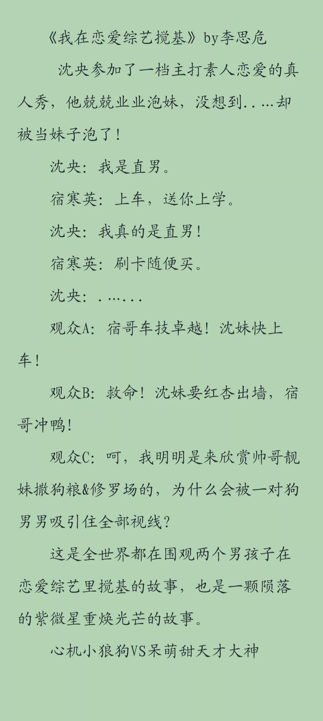 短评:大概就是前电竞大佬呆萌可爱受为了佣金参加了一档恋爱综艺,在里面遇到了专门为他而来的心机迷弟小狼狗攻,在小狼狗的猛烈攻势下,两人逐渐产生感情,最后发展成全员围观他们谈恋爱的故事。前半部分主要是恋综,后来有涉及到一些电竞,攻受到受的影响也去当了一名电竞选手,而受在大家的帮助下澄清了当年的冤案,重新投身自己热爱的电竞赛场。观众磕cp那几段我还挺有代入感的。