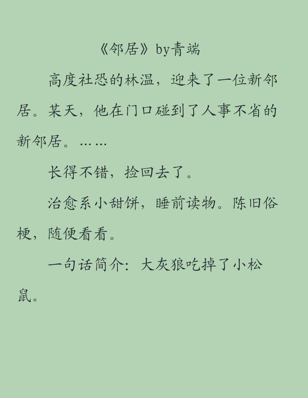 短评:简介很准确,大灰狼吃掉了小松鼠,大概就是社恐软萌受遇到了成熟稳重温柔体贴的攻,两人是邻居,最后被吃干抹净的故事,攻很尊重受也很会撩,循序渐进,水到渠成,两个人算互宠吧,最后受的家人来了一波助攻,两人顺理成章在一起了。甜而不腻,睡前可以看。