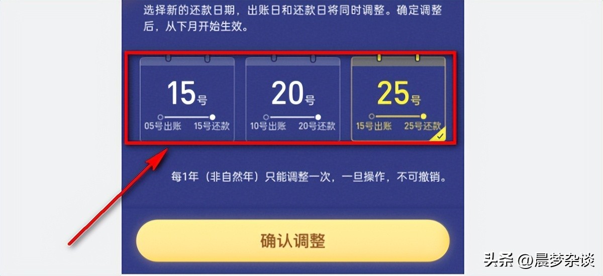步骤六:在页面的下方有三个选项供我们选择,分别是:15号、20号、25号,在还款日的下面也有详细的说明,比如说5号出账就是15日还款,10号出账就是20号还款,15号出账就是25日还款。