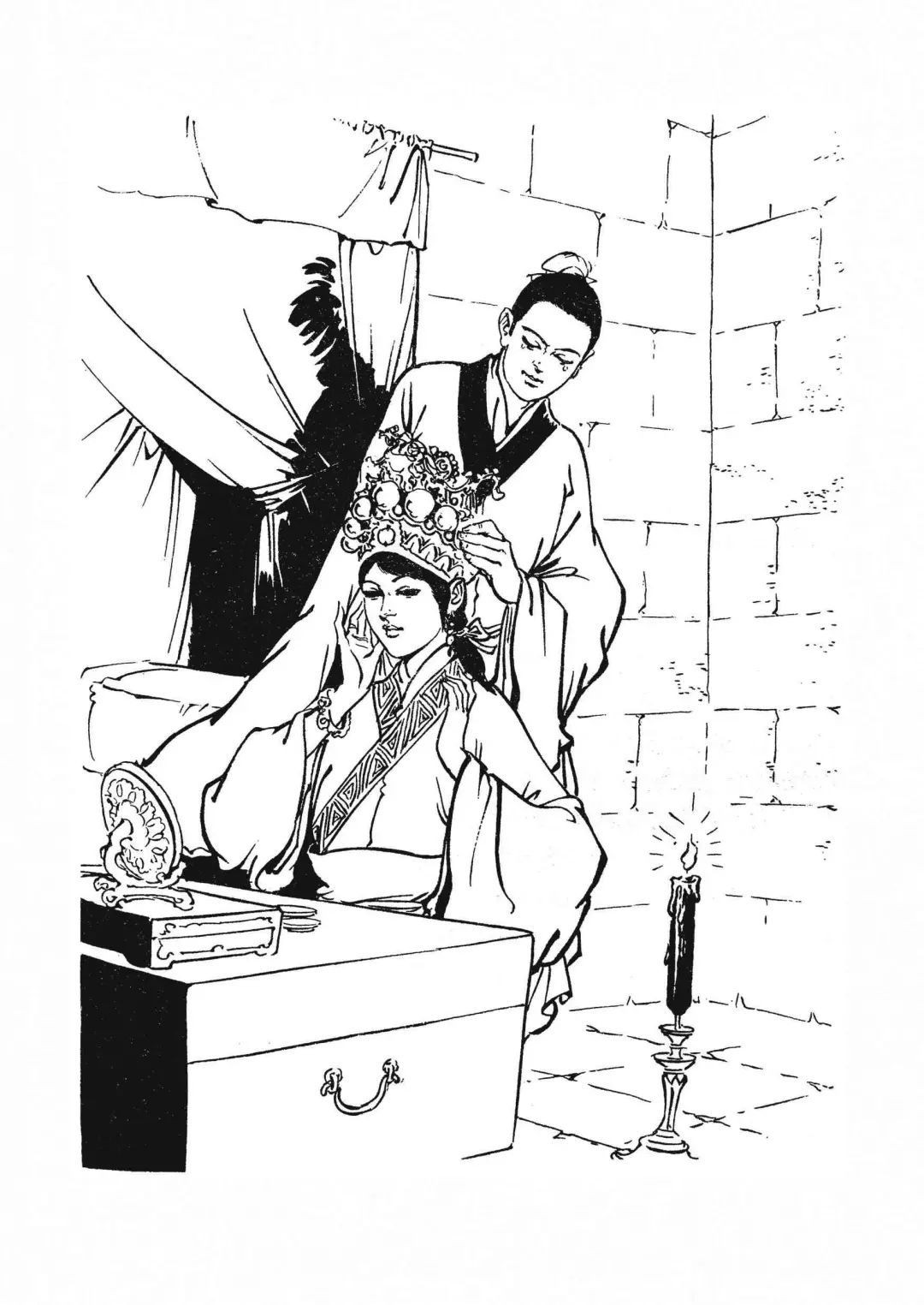小龙女戴上耳环,插上珠钗,手腕上戴了玉镯。杨过泪流满面,悲不自胜,拿起凤冠,到她身后给她戴上。小龙女在镜中见他举袖擦干了泪水,再到身前时,脸上已强作欢容。