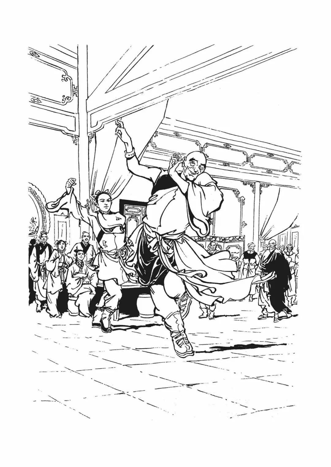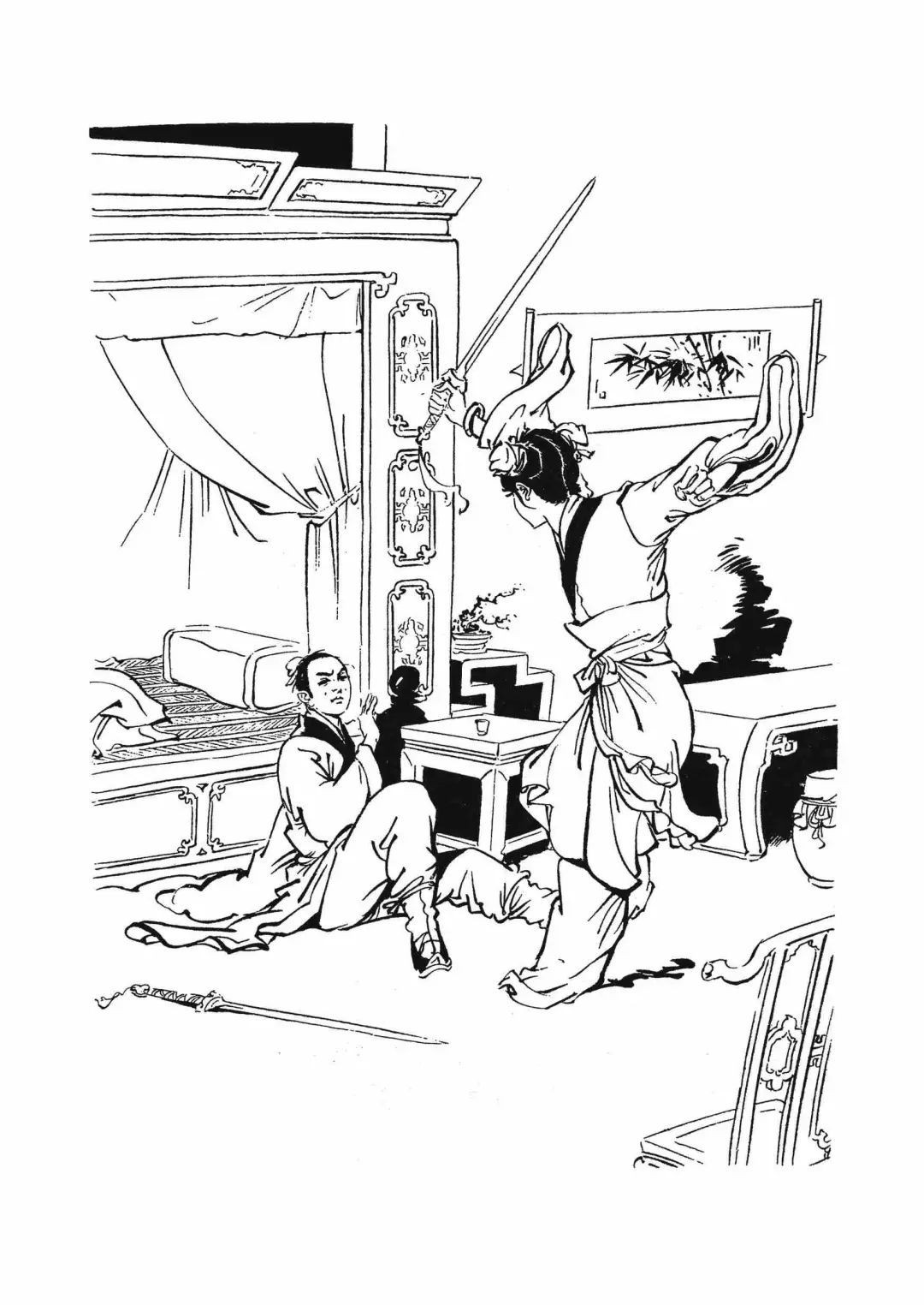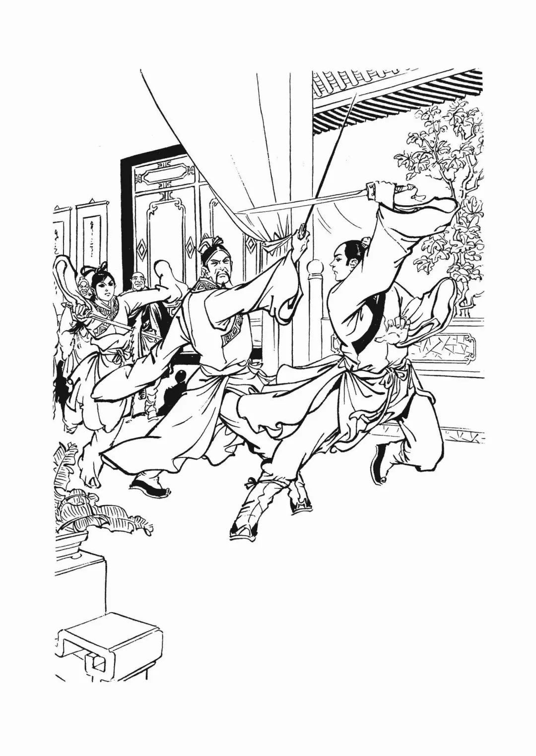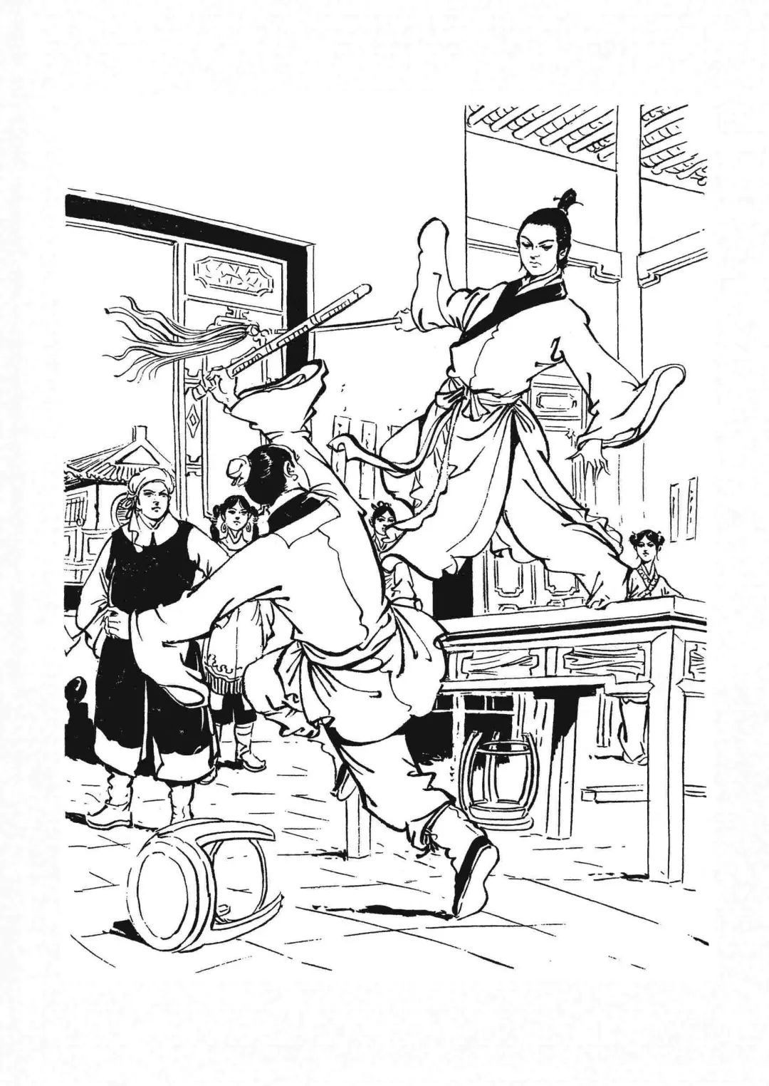 李莫愁见杨过剑法惊奇,自己每招每式都在他意料之中,心下怨恨师父偏心,突然纵身跃到桌上,右足斜踢,左足踏在桌边,身子前后晃动,飘逸有致。