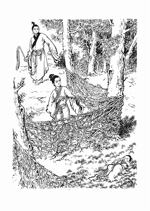 “杨过睡在石床上寒冷难当,全身发抖。只见小龙女取出一根绳索,在室东的一根铁钉上系住,拉绳横过室中,将绳子的另一端系在西壁的一根钉上。她轻轻纵起,横卧绳上。”