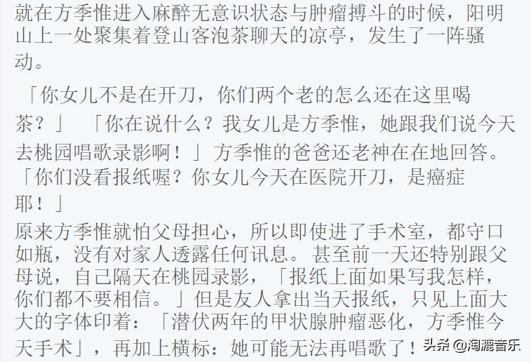 方季惟被医生诊断出甲状腺滤泡癌,正好长在声带旁,极有可能影响今后的歌唱事业。