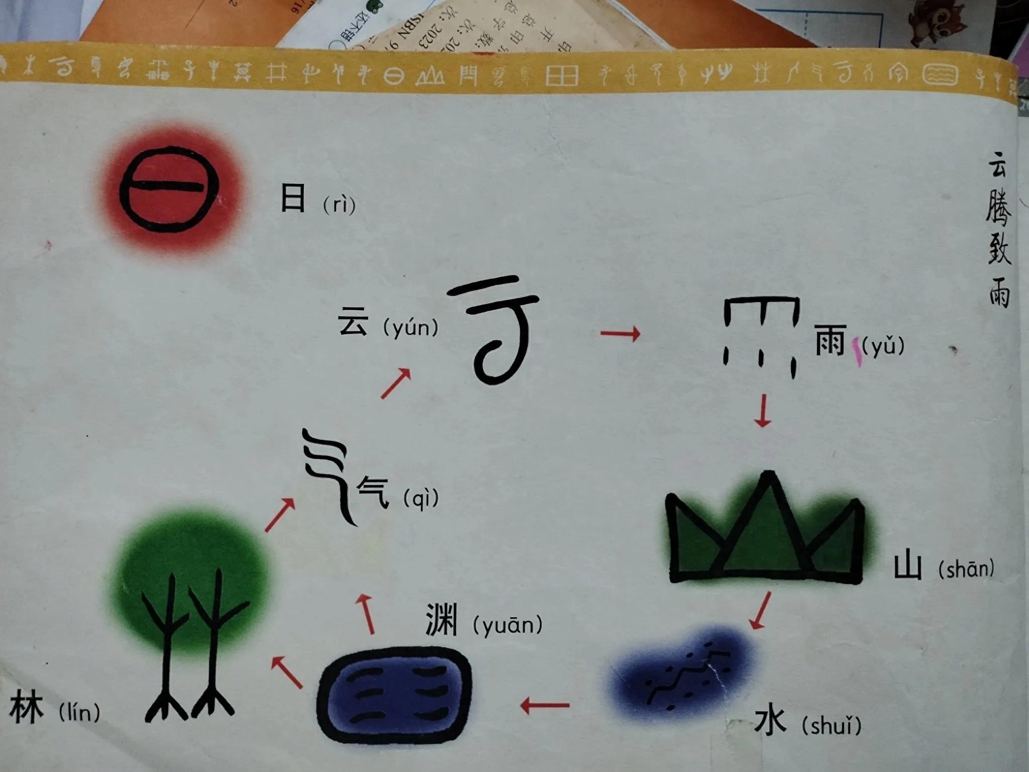 “雨”,象形为积云降雨的情形,像天上下雨的样子,雨水是天地二气交会所成,它滋养万物。“山”,就是我们平常所看到的山的形状。“水”,像水流淌,有波浪的样子。“渊”,像一个封闭的水域,里面有很多的水,就是深渊(上图所示是横着的,可倒立过来看)。“林”,两颗树木长在一起,双木成林。“日”,像太阳的样子,中间的横,有的甲骨文写成一点,代表太阳黑子。“气”,像水蒸气升腾上天的样子。云”字甲骨文,象形云气回转的形状,古人认为“云”是山川之气,就是地气上升后形成的。