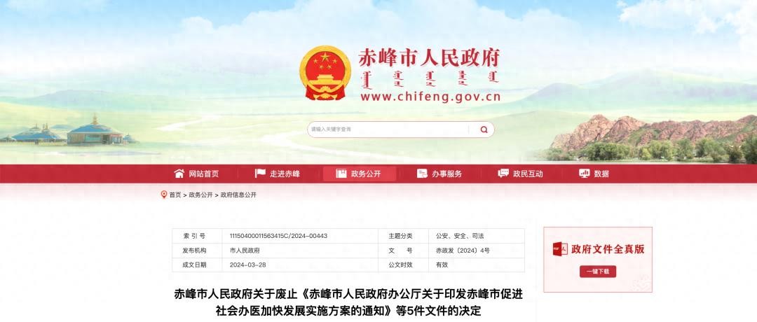 为全面贯彻铸牢中华民族共同体意识工作主线,市政府对市本级现行有效涉民族的行政规范性文件进行了清理,决定对《赤峰市人民政府办公厅关于印发赤峰市促进社会办医加快发展实施方案的通知》(赤政办发〔2016〕11号)、《赤峰市人民政府办公厅关于印发〈赤峰市居民基本医疗保险办法〉的通知》(赤政办发〔2016〕53号)、《赤峰市人民政府办公厅转发市卫计委等部门关于推进医疗卫生与养老服务相结合实施意见的通知》(赤政办字〔2017〕40号)、《赤峰市人民政府办公厅关于印发〈赤峰市全面推开城市公立医院综合改革实施方案〉的通知》(赤政办发〔2017〕10号)、《赤峰市人民政府办公厅关于印发赤峰市医疗联合体建设实施方案的通知》(赤政办发〔2017〕48号)5件文件予以废止。