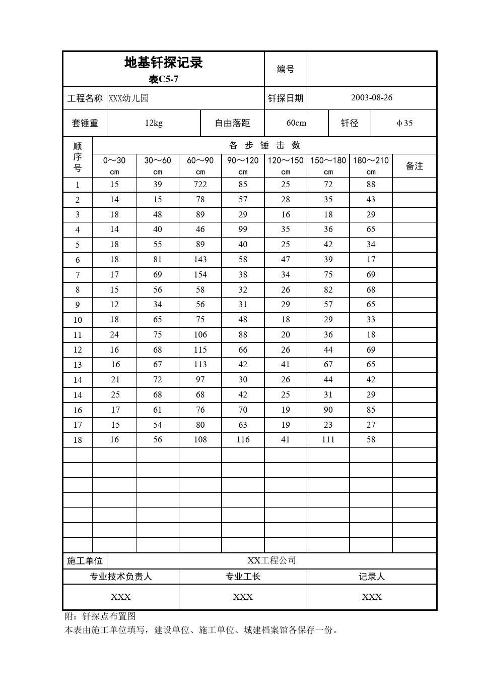 因此,地基钎探是必须要做的,施工单位需要收集的资料:在钎探时做地基钎探好记录,并绘制钎探点布置图。钎探点的布置具体要求是纵横向1.5m,梅花桩布置,纵横交叉。