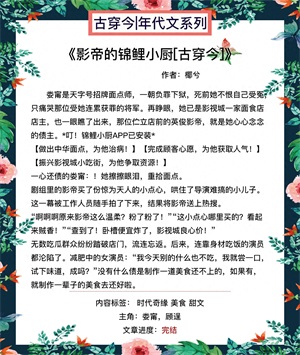 【短评】:古穿今美食经营文,娱乐圈,轻松治愈。前世,男主因女主而死。女主穿越到现代后,和男主在现代相遇。女主完成美食任务能够帮男主~
