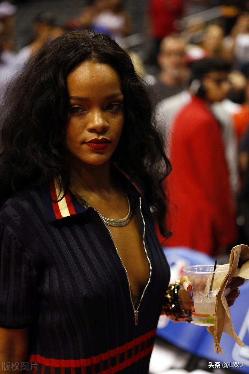 2014.4.9,美国,洛杉矶,蕾哈娜出席某赛会,大波浪中分披发,烈焰红唇,银扁项链,深蓝条纹短袖拉链衫。酥胸微露。