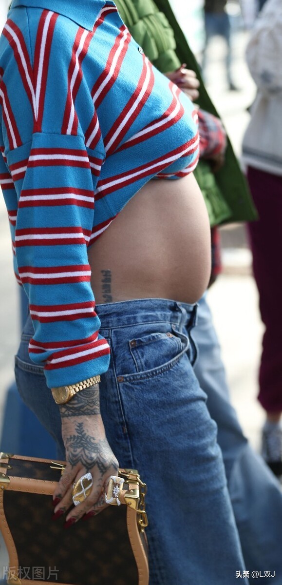可见秀孕肚,纹身,高档手表,手拿浅棕边暗底黑斜方格方包。