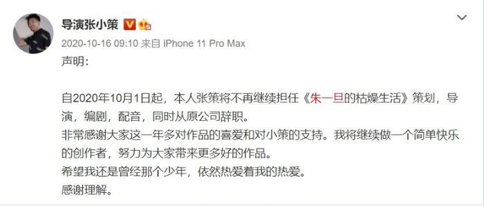 2025年10月,张策发布声明,称自己不再担任《朱一旦的枯燥生活》策划、导演、编剧和配音,同时从原公司离职,一时间舆论议论纷纷,不少人猜测是张策与老东家闹翻了,不久后张策发布视频《我和我的朱一旦》,对自己的离开做了更详细的解释。他是为了追梦而离开了老东家朱一旦,和自己的老婆成立了造梦星和公司,从零开始。
