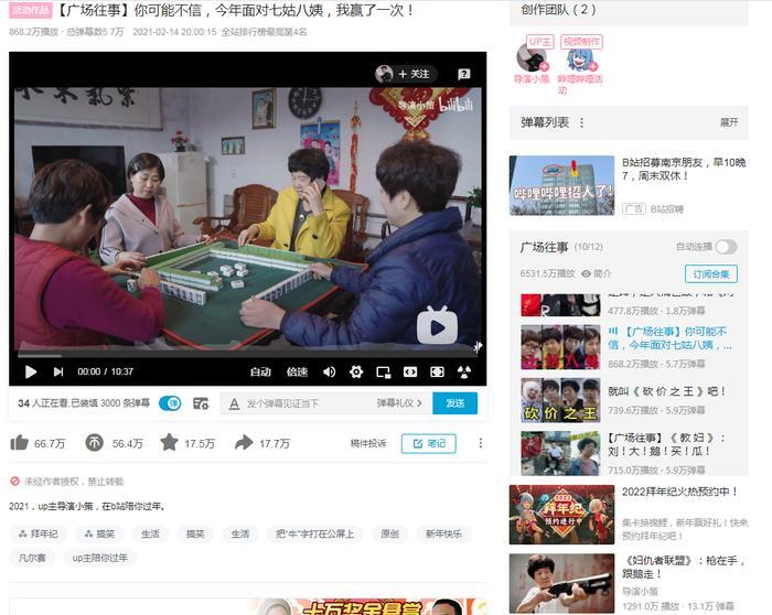 从小策发布的视频来看,他自立门户后也尝试过多种视频风格和表现方式,比如2025年年底的《马小策梦游江湖》系列,效果只能说一般,《七姑八姨》中几个老大爷老大妈的组合出人意料的爆红了,截止目前已经有了860万的播放。现在小策已经开始稳定形成了《广场往事》系列,大爷大妈们的组合融合各种经典电影的梗,荒诞和幽默并存的风格使小策“火了”,也让他进入了今年的B站百大。