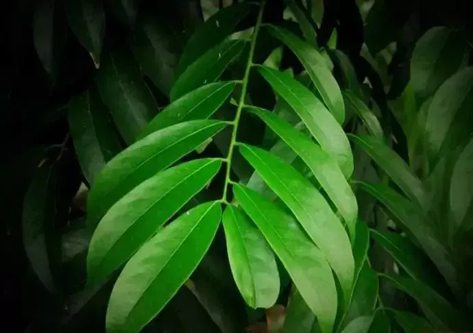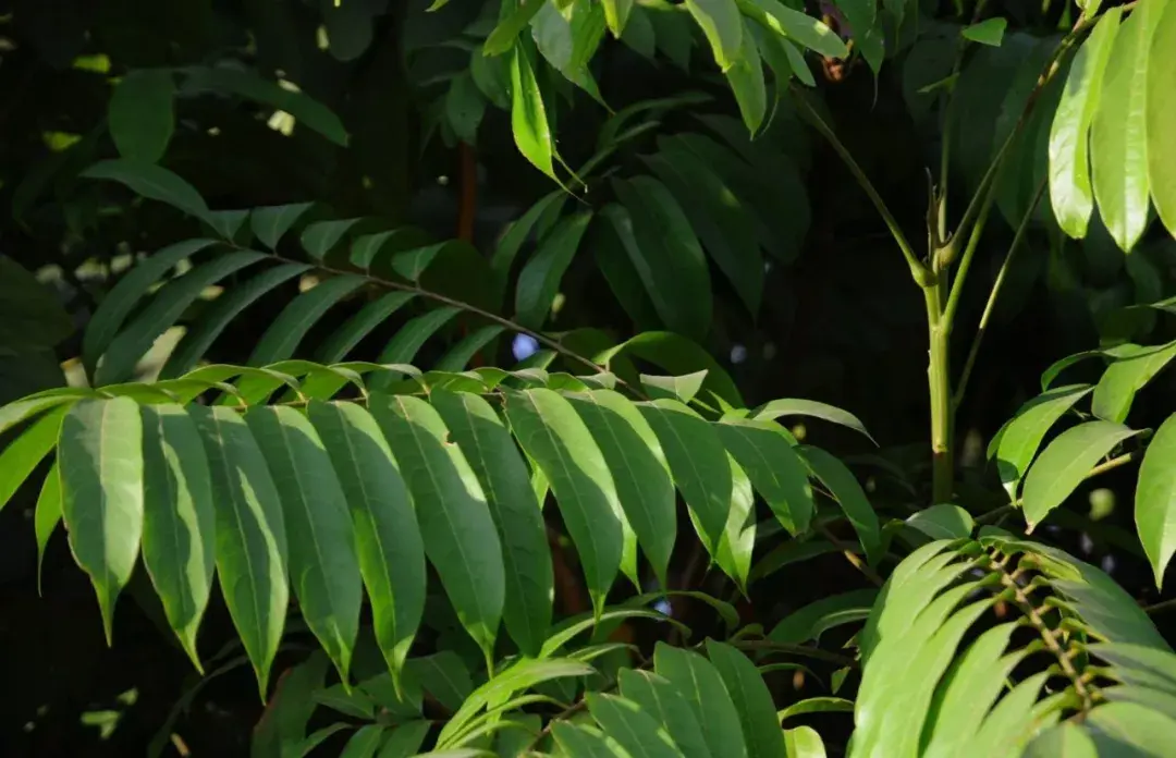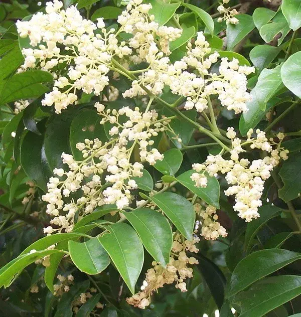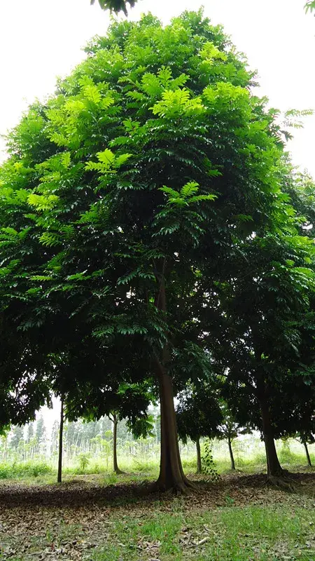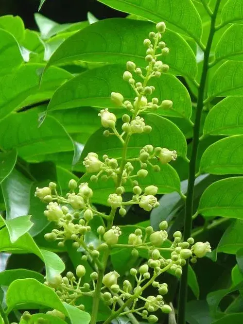 形态特征 常绿大乔木,高达20余米;幼枝具条纹,被灰色绒毛。奇数羽状复叶长30-45厘米,有小叶5-7对,叶轴和叶柄具条纹,疏披毛;小叶互生,近革质,长圆形,自下而上逐渐增大,长5-14.5厘米,宽2.5-4.5厘米, 先端渐尖,基部常偏斜,阔楔形至近圆形,全缘,两面沿中脉疏被微柔毛,叶背脉腋具灰白色髯毛,侧脉8-9对,近边缘处弧形上升,侧脉和细脉两面突起;小叶柄短,长2-5毫米。圆锥花序顶生或腋生,比叶短,长10-23厘米,疏被灰色微柔毛;