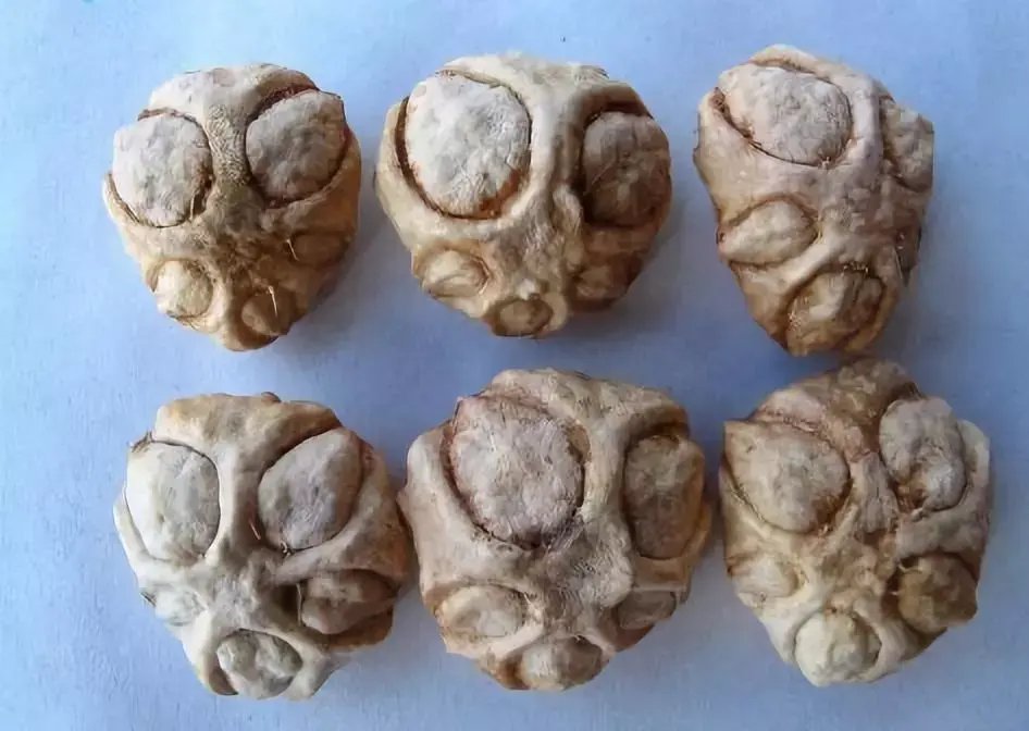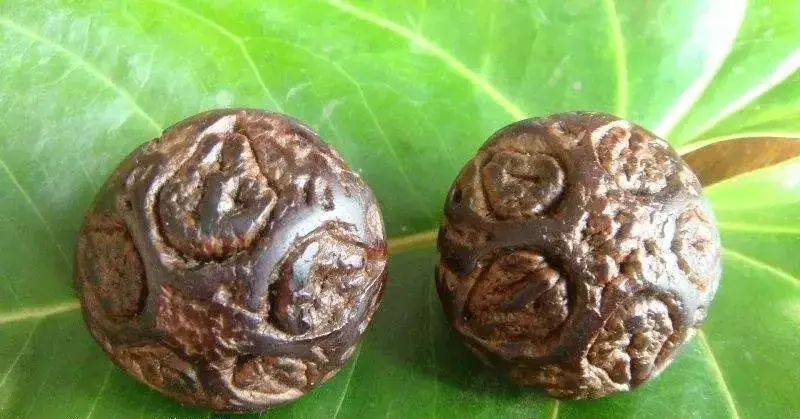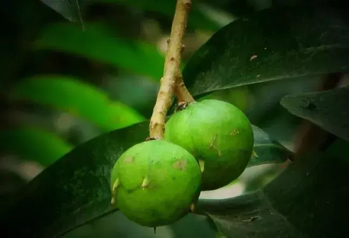 核果扁球形,长约2厘米,径约2.5厘米,成熟时黄色,果核压扁,径1.7-1.9厘米,上面盾状凹入,5室,通常1-2室不育;种子3-4颗。