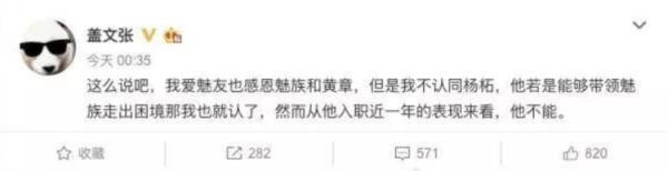 4月15日,“魅族总监的文创总监张佳@盖文张 在微博上发表公开言论,表示“这么说吧,我爱魅友也感恩魅族和黄章,但是我不认同杨柘,他若是能够带领魅族走出困境那我也就认了,然而从他入职近一年的表现来看,他不能。”