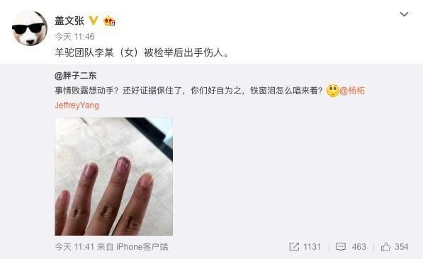 4月17日,有魅族员工放出手指受伤照片,张佳转发微博称是杨柘团队的女员工被检举后出手伤人。随后,另有员工表示,其实是“他们”想要打女生,不要歪曲事实。