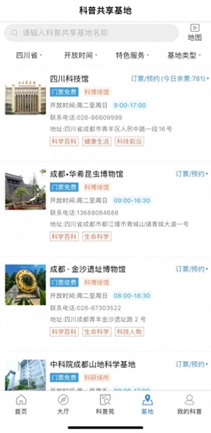 下载并打开天府科技云APP,点击“科普共享基地”,选择“四川科技馆”就可根据提示进行预约了。APP上每日有1000个名额,可预约近三天的门票。