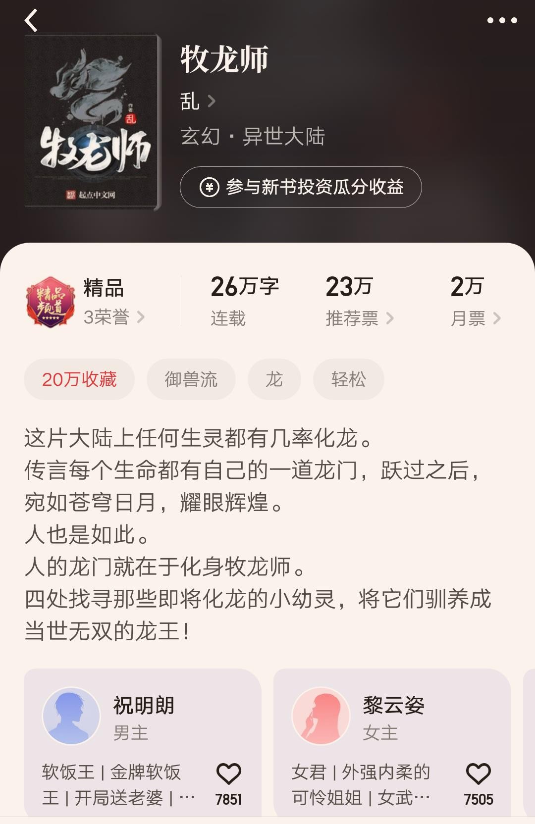 这本小说吸引小编的地方就是故事的载体,龙。牧龙师,与龙为伴,以牧龙为职业,龙的能力与牧龙师息息相关,又决定着牧龙师的战力,非常新奇有趣。