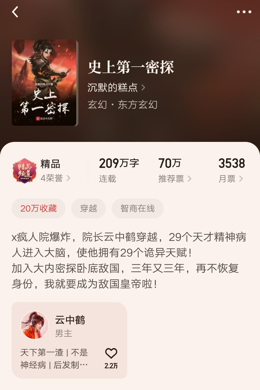 推荐理由:这是继《史上第一赘婿》之后,沉默的糕点连载的又一玄幻爽文。小说讲述了一个意外穿越成阶下囚,又意外变身密探的倒霉蛋,闷骚无下限地搅乱历史的故事。