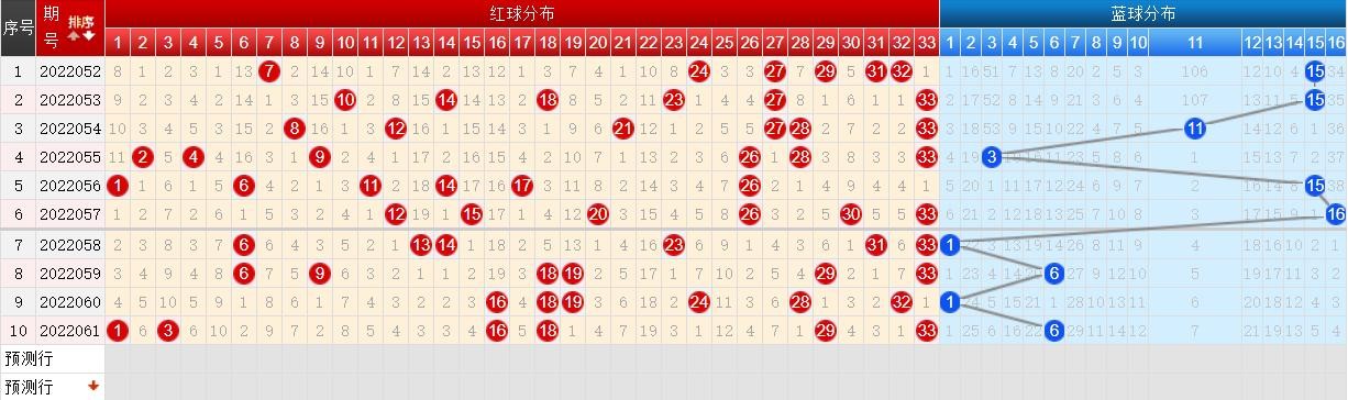 2022年5月31日晚,中国福利彩票双色球第2022061期开奖结束,当期开奖号码为:红球01、03、16、18、29、33;蓝球06。