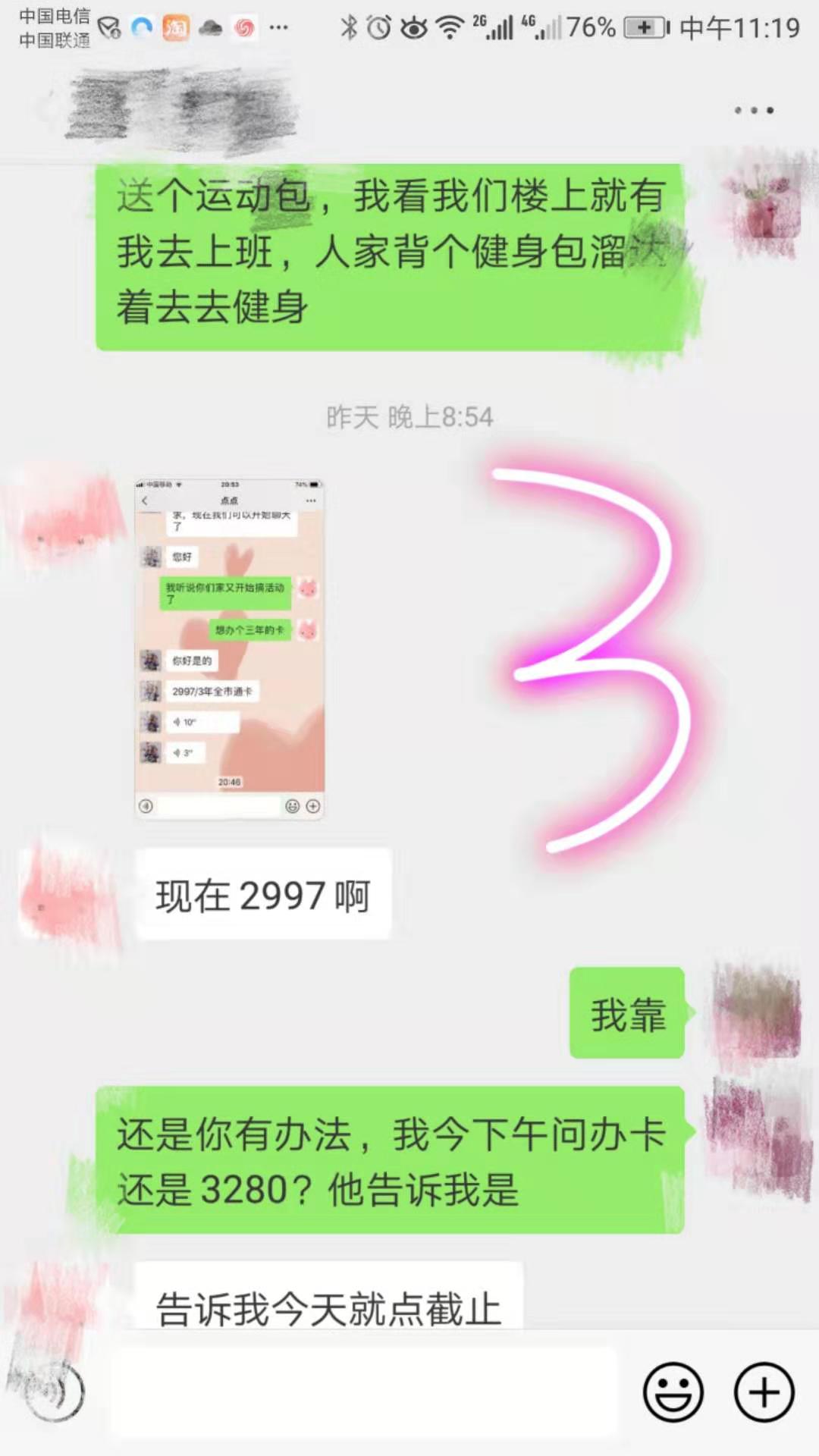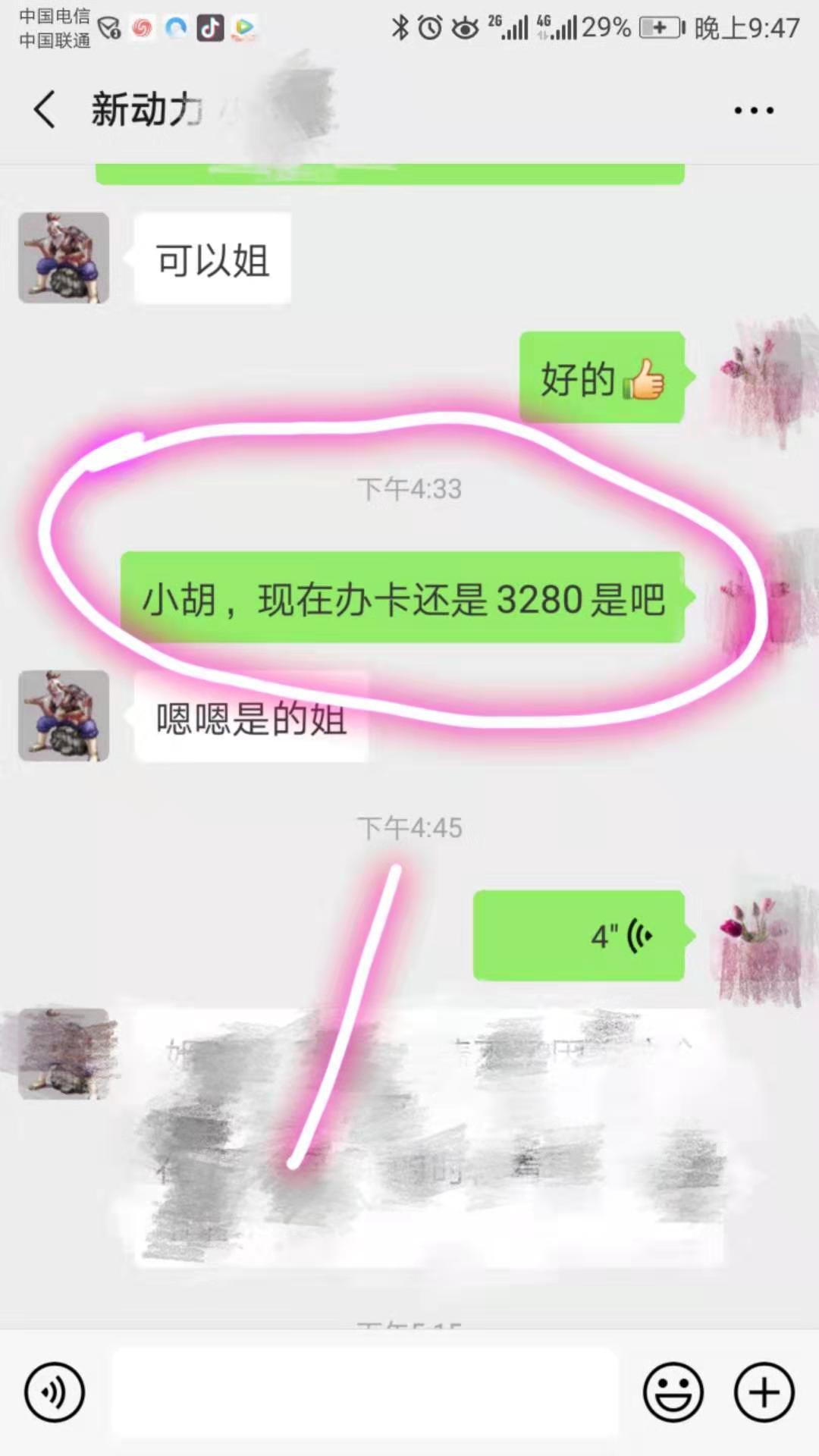 “我前几日刚在台湾村新动力办的卡,三年3280元,通过几天锻炼感觉健身两个人一起的话更能坚持下来,就介绍朋友一起健身。3月10日下午4点20分帮朋友联系了之前接待我的销售顾问,咨询办卡是否还是3280元,他明确说是。当天晚上我把咨询结果告知朋友,为了给销售经理算任务,特意让朋友加了他微信,还给了电话,结果朋友以陌生人的身份咨询,却被告知只需要2900多元就可。”王女士说,同一天时间出现两个价格,且她告诉朋友的价格还要高出几百元,店家的不诚实让她很生气。“我好意帮你介绍客户,办卡的活动政策不介绍不说,还要隐瞒,着实让人生气,感觉特别不尊重人,欺骗和欺瞒我。”