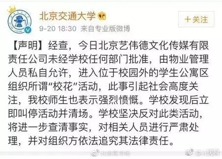 近日,北京交通大学学生公寓前出现“共享校花”活动,扫码就能与“校花”谈恋爱5分钟。知情者透露:是某app宣传活动,“校花”是外面找的。20日,北京交通大学官微发表声明:活动未经学校批准,将追究组织者法律责任。