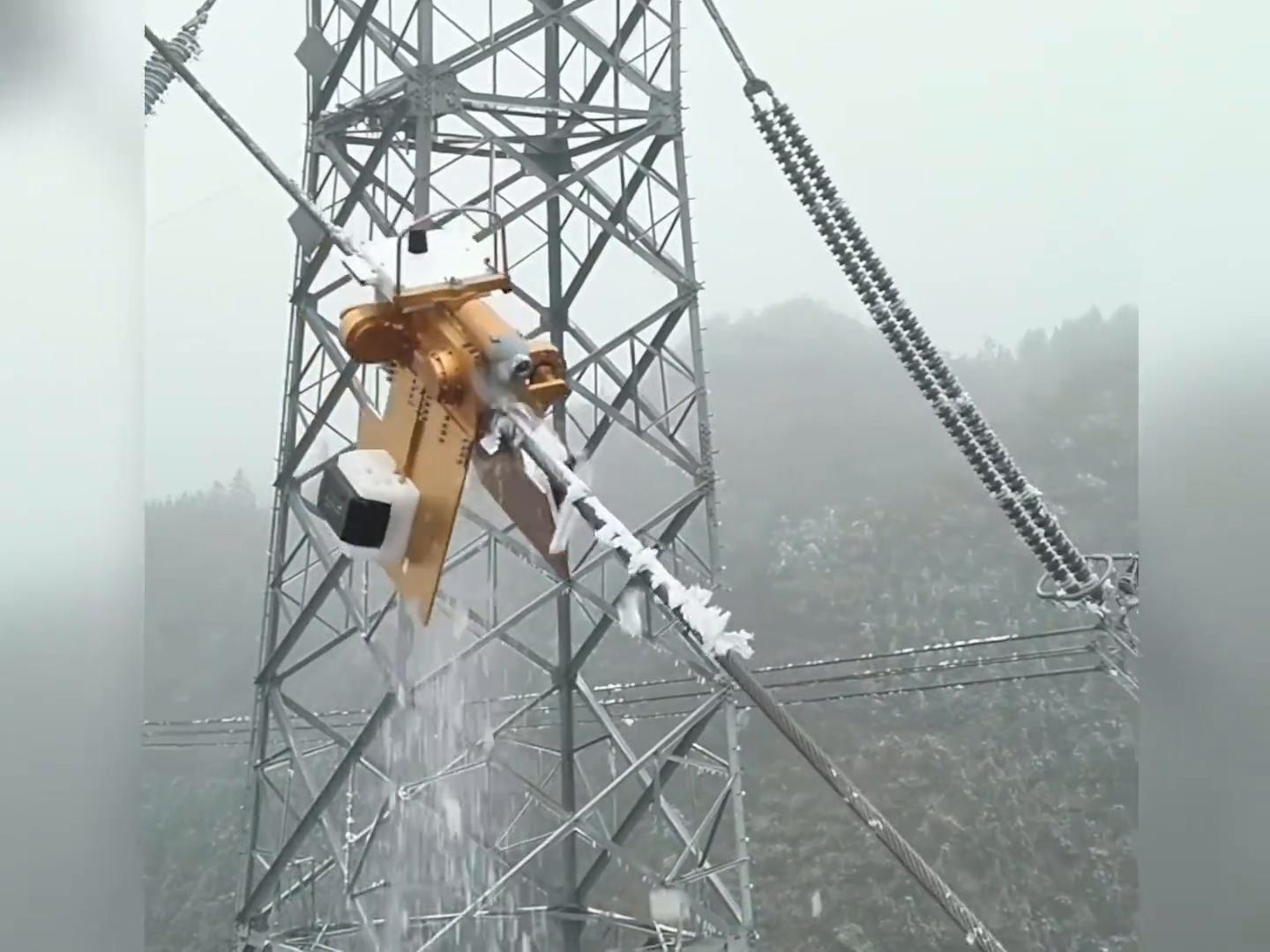 破冰机器人高空精准落下开展除冰作业。