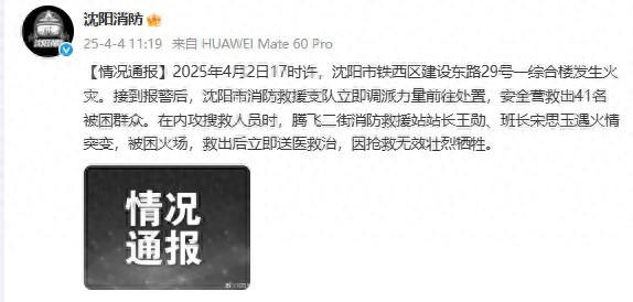 据沈阳消防消息,2025年4月2日17时许,沈阳市铁西区建设东路29号一综合楼发生火灾。接到报警后,沈阳市消防救援支队立即调派力量前往处置,安全营救出41名被困群众。在内攻搜救人员时,腾飞二街消防救援站站长王勋、班长宋思玉遇火情突变,被困火场,救出后立即送医救治,因抢救无效壮烈牺牲。