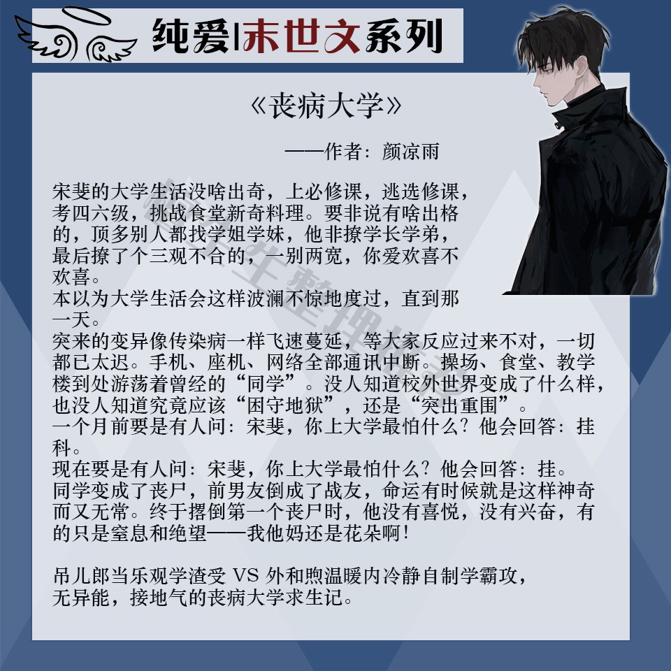小短评:吊儿郎当乐观学渣受和外冷内热学霸攻,接地气的丧病大学求生记,没有金手指,没有异能,就是一群普通的大学同学,与丧尸展开殊死搏斗,接地气,存希望。当然还有经典的破镜重圆梗,攻君教导主任作派总逼着受学习,小受放荡不羁爱自由,一直被管教他再也受不了,就主动提出分手。然后,就没有然后啦,攻君那低情商一脸懵还在那琢磨为何分呢?在大学再碰面,受假装两人不认识,攻君总巴巴凑过去团结友爱一番,两人你追我躲感情戏怎么刷也刷不动。直到有同学感染了病毒变丧尸,整个校区开始沦陷。两位主角从前任变成战友,并肩作战打丧尸什么的,就很自然旧情复燃啦。期间陆续有新伙伴加入,组成了一个团体开始自救行动……
