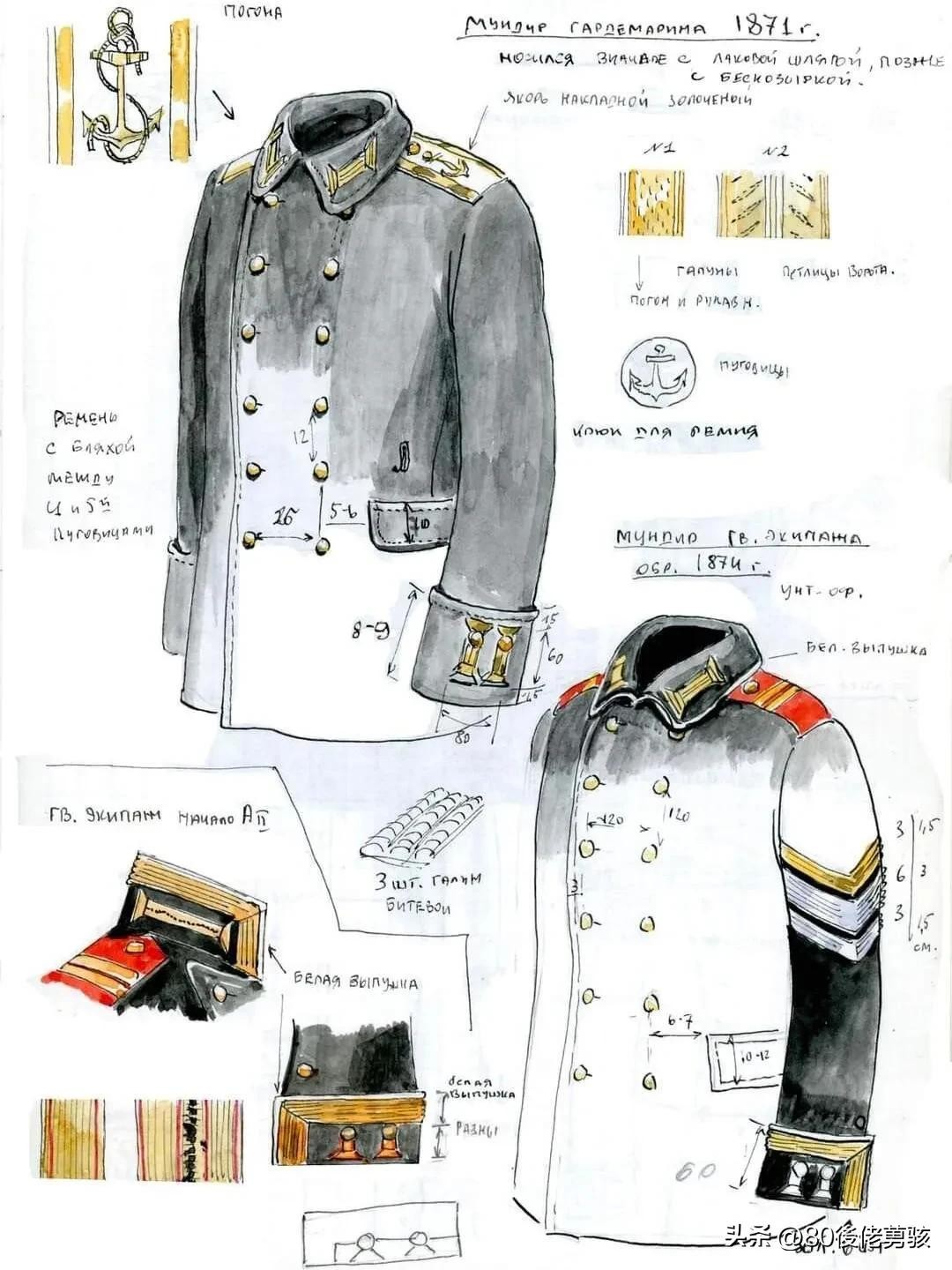 水兵服最早出现在1857年的英国,在1980年,当时的英国将领便将穿着的制服命名为“水手服”,到了1857年正式确定了“水手服”的统一样式;1862年,俄国海军开始配发水兵汗衫,1872年,俄国海军的水兵帽帽墙上开始标注舰名、舰队、海校等名称,并加入了黑色飘带,以纪念帆船时代的水手用布条标识风向。