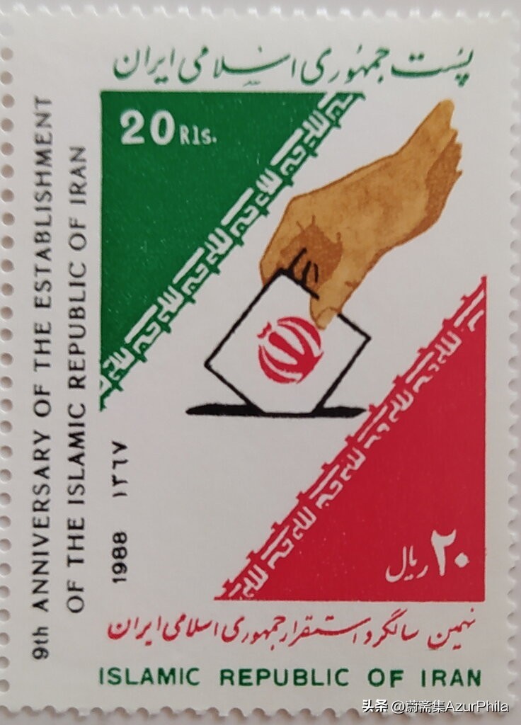 1988年是伊朗伊斯兰共和国成立9周年,邮票以伊朗国旗为元素设计的投票箱,而国旗而是人们手里选票,这象征着伊朗人民推翻专制统治后取得的选择权。这个设计也是相当有意思。