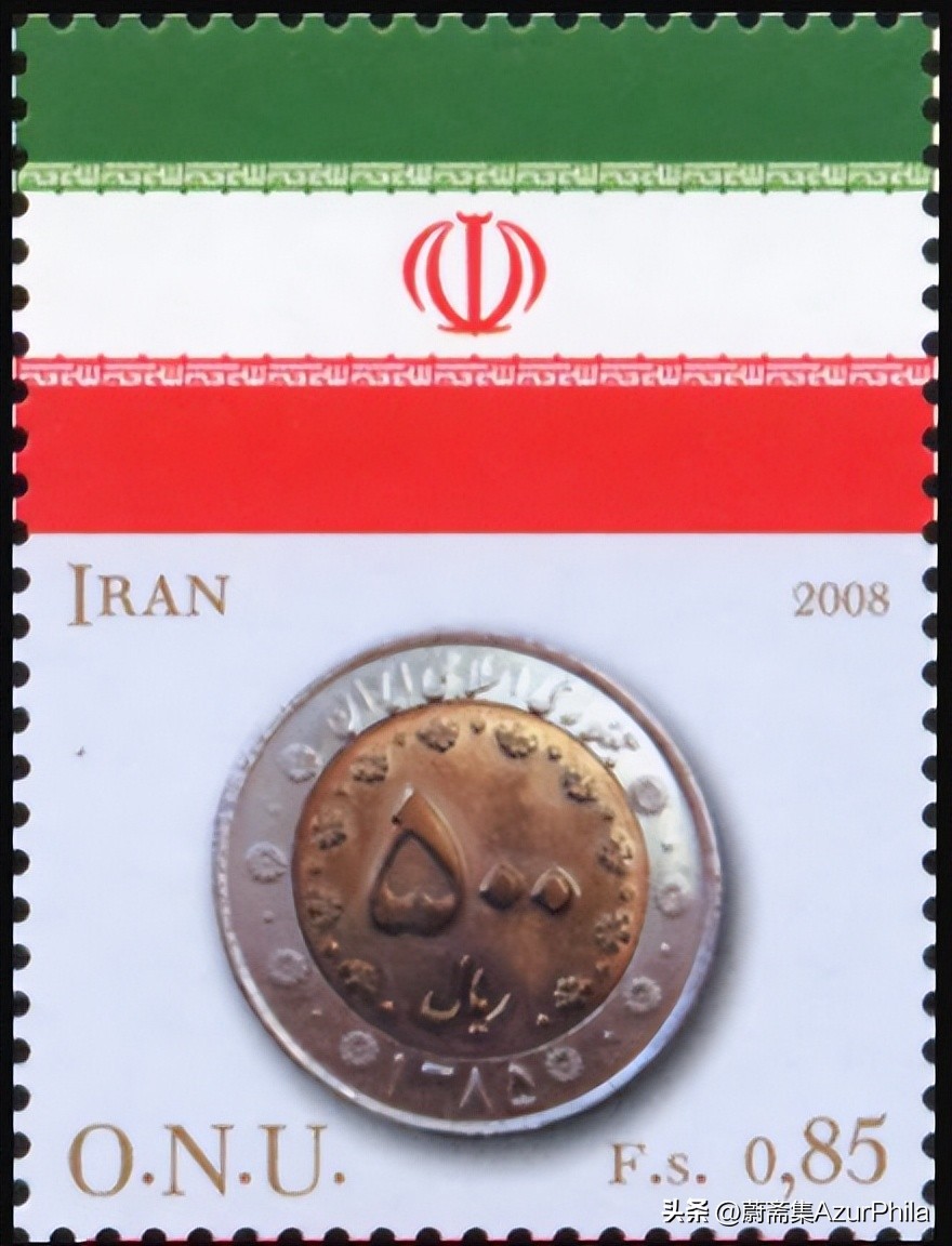 伊朗的货币叫里亚尔(Iranian Rial,代号 IRR),2008年联合国发行的伊朗国旗与硬币邮票采用是面值为500里亚尔的硬币,硬币上的数字用阿拉伯字母。