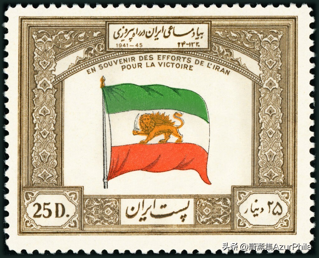 伊朗1949年发了纪念二战胜利的邮票,国旗图案为一面伊朗国旗,这也是最早出现在邮票上伊朗国旗。