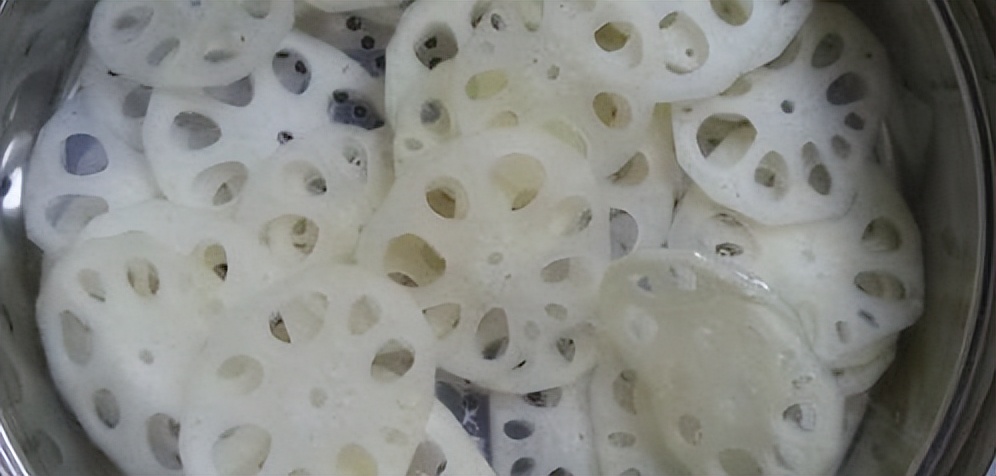 3、把冷水倒入锅中大火烧开,将藕片放入水中煮到