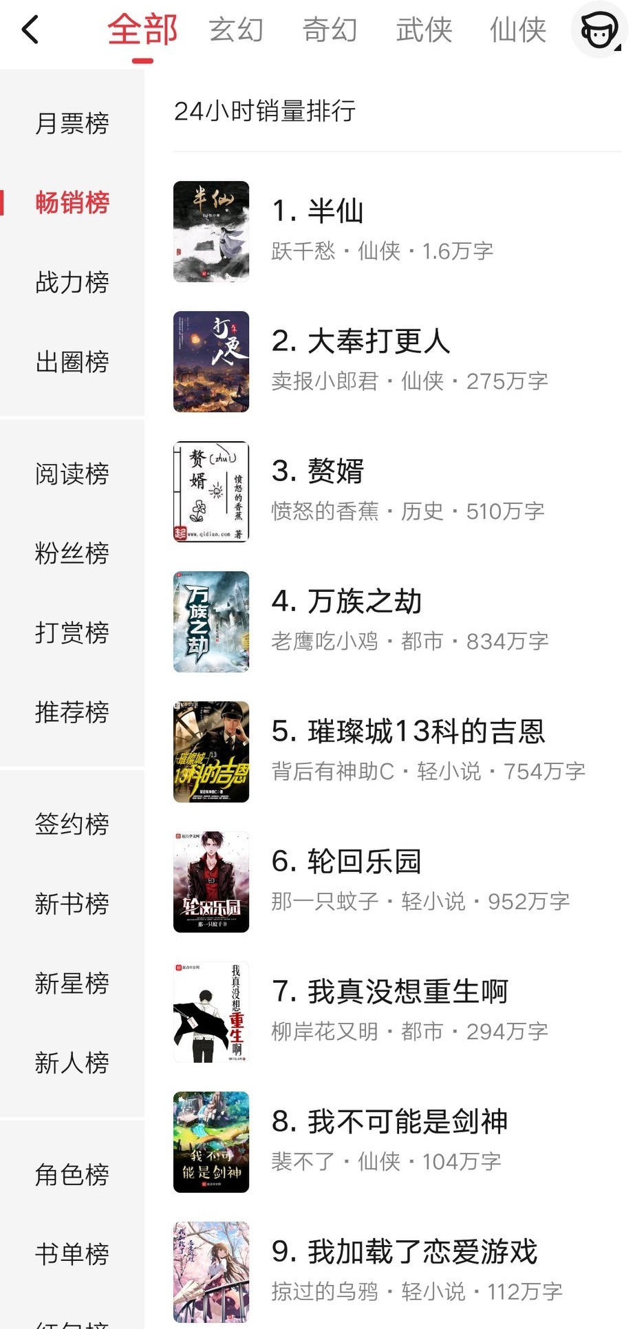 《半仙》在得到书友的大力支持之下,挤下了《大奉打更人》,直接空降畅销榜第一,当然明天也就掉下去了。