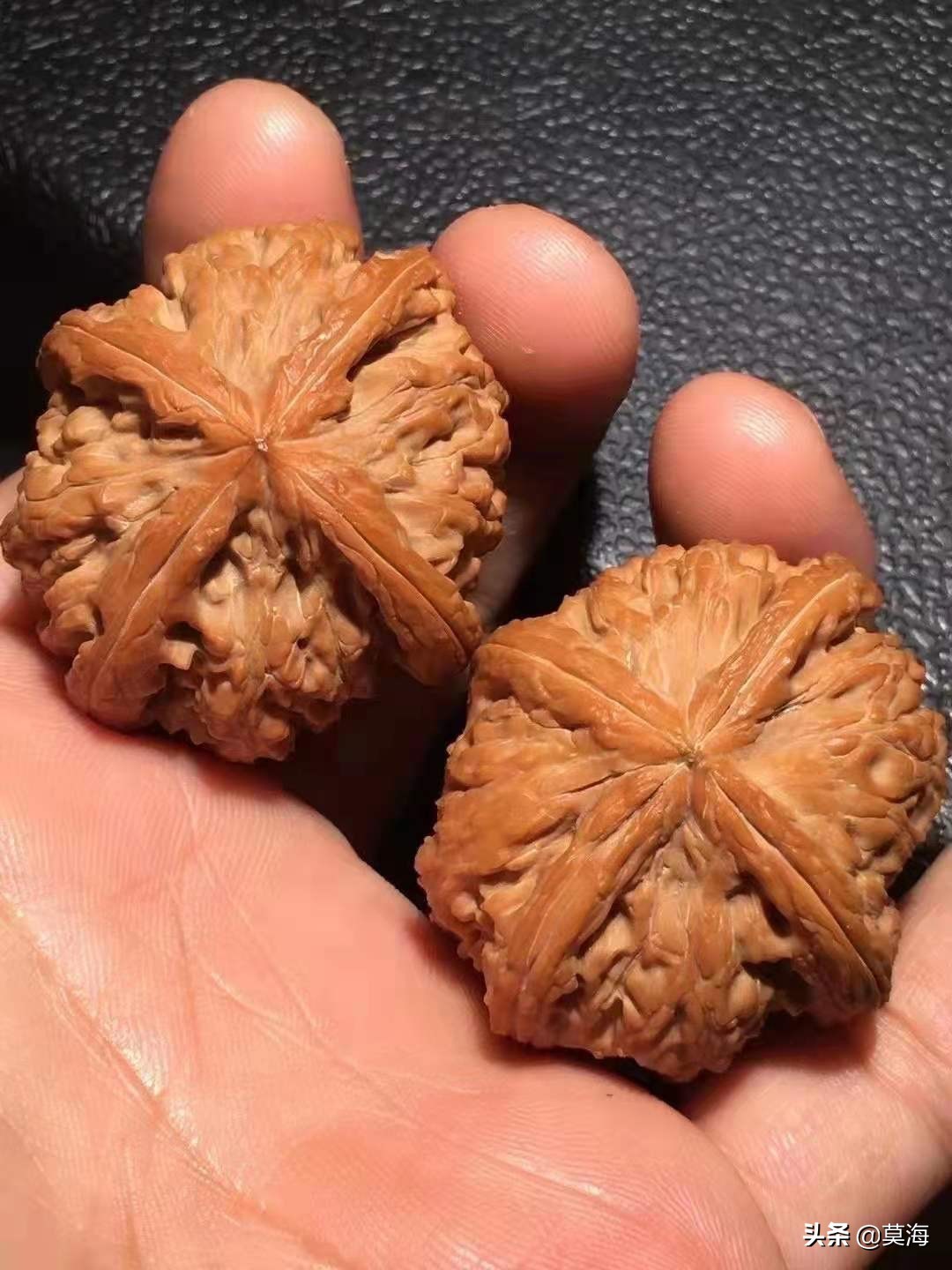 不过,真的有天价几十万的文玩核桃吗?去掉那些有历史,有传承的包浆老核桃不说,新下树的一对小小掌上玩物,动辄几千,几万甚至十几万,到底是炒作还是物有所值呢?有句话叫物以稀为贵,在这个人为干预越来越普遍的文玩核桃市场,嫁接,打药,上夹板,导致野生的核桃青皮越来越少,嫁接打药出来的核桃虽然形状越来越好看,尺寸越来越大,可皮质密度却大不如从前,一颗老树或是野生核桃树出不了几个能配上对的原生果,这就导致了原生,野生大尺寸文玩核桃价格奇货可居,高的离谱,可也不是炒作和虚高,文玩核桃确实有一块高端的市场,资深玩家宁愿花高价抓一对没有人工干预,自然生长,高密度大尺寸配对好的名贵品种,说是拿在手里,看在眼里,心里得劲,文玩核桃玩的就是这份惬意。还有就是一些异性核桃,比如三棱,四棱甚至五星上将,连体,鹰嘴,半壁江山等等品种,价格一直居高不下,也是因为产量极低,配对太难。比如一对白狮子的五棱核桃,好几百颗树上的青皮,或许能开出一只五棱的核桃,那么这只核桃的价格就已经很高了,需要经过几个月甚至几年的时间,从器型,大小,骨质,皮质上去找另外一只五棱的核桃,给它配上对,也就是文玩核桃的娶妻。这样的一对异性的核桃无论从人力,财力,时间上来看,价格只能很高,甚至能配上对的那一只核桃开价几万也比比皆是,所以这样的一对核桃卖价几万,十几万也就不足为奇了。