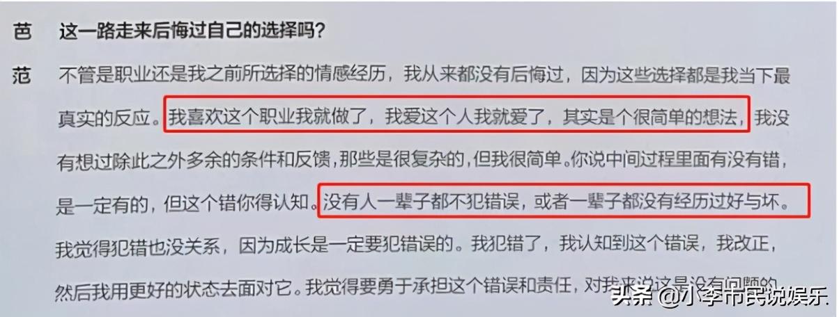 日前范冰冰接受某媒体的采访时,谈到了之前的事情,在被问到是否对自己的原则后悔时,范冰冰坦言从来没有后悔过,当然范冰冰说的是选择的职业和之前的那段情感经历,喜欢这个职业就做了,爱这个人就爱了。就是这么简单和单纯,同时范冰冰也认为没有人一辈子不犯错的,犯错没关系,因为成长一定要犯错,犯错了,要改正还要敢于去面对!