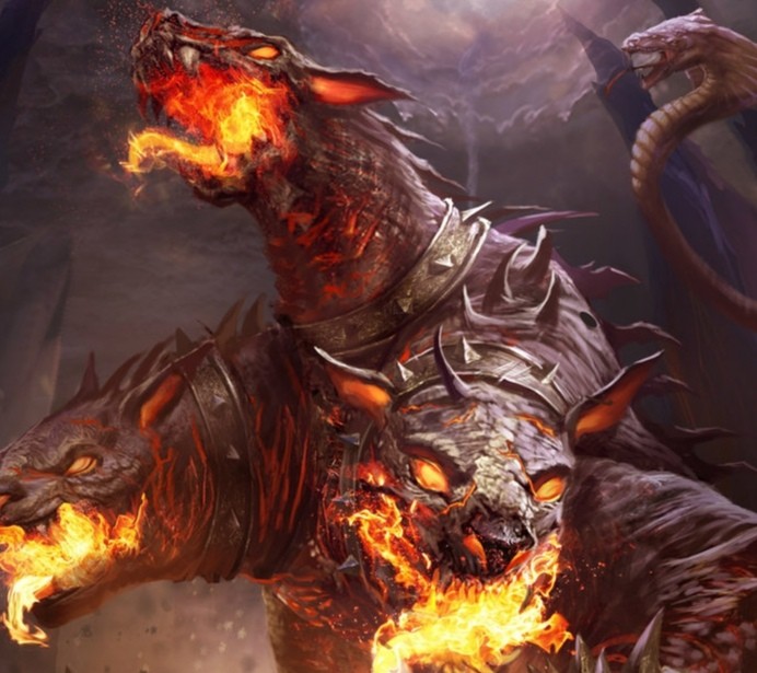 按照传统说法,刻耳柏洛斯为众妖之祖堤丰与蛇身女怪厄客德娜所生。这怪物的外形凶恶可怕:它有许多个头,还长著蛇的尾巴,脖子上也盘绕着毒蛇。海克力士把这狗从冥界带到地上后,它在狂吠时从嘴里喷出毒液,毒液所落之处生出了乌头属植物(奥维德在《变形记》里描写,美狄亚用乌头的汁液制成毒剂)。
